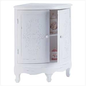 Adorable little corner cabinet safely stores your cherished items behind curved doors. White "Shabby Elegance" finish lends a terrific timeworn appeal. Wood. 13 3/4" x 10" x 15 1/2" high.